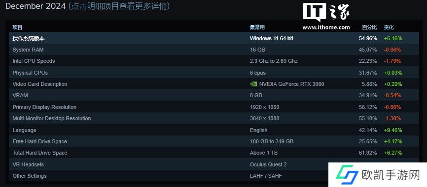 本站 1 月 2 日消息,根据最新的 2024 年 12 月 Steam 硬件和软件报告,Windows11 在操作系统中的份额已达54.96%,环比增长了 6.16 个百分点,同比增长 13.01 个百分点。