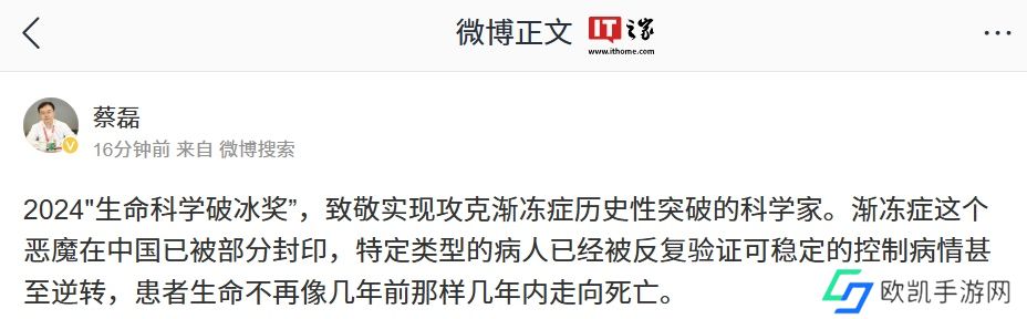 本站注意到,蔡磊本人今日也在微博发文称,“渐冻症这个恶魔在中国已被部分封印,特定类型的病人已经被反复验证可稳定的控制病情甚至逆转,患者生命不再像几年前那样几年内走向死亡。”