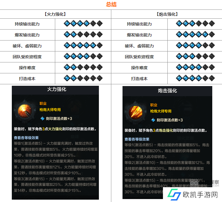 【炮击强化】:牺牲机动性换取更高的伤害和暴击,需要一定的副本熟练度,且由于是专长职业,越往后优势越明显。