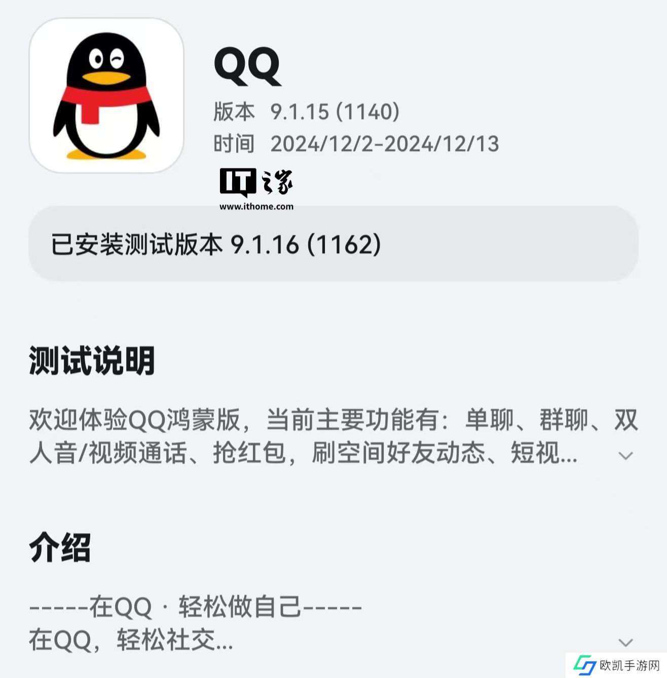 本站 12 月 12 日消息,纯血鸿蒙版 QQ 应用昨日晚在华为应用市场(App Gallery)开启测试版 9.1.16(1162)邀测升级,测试时间为 2024/12/11 - 2024/12/18。