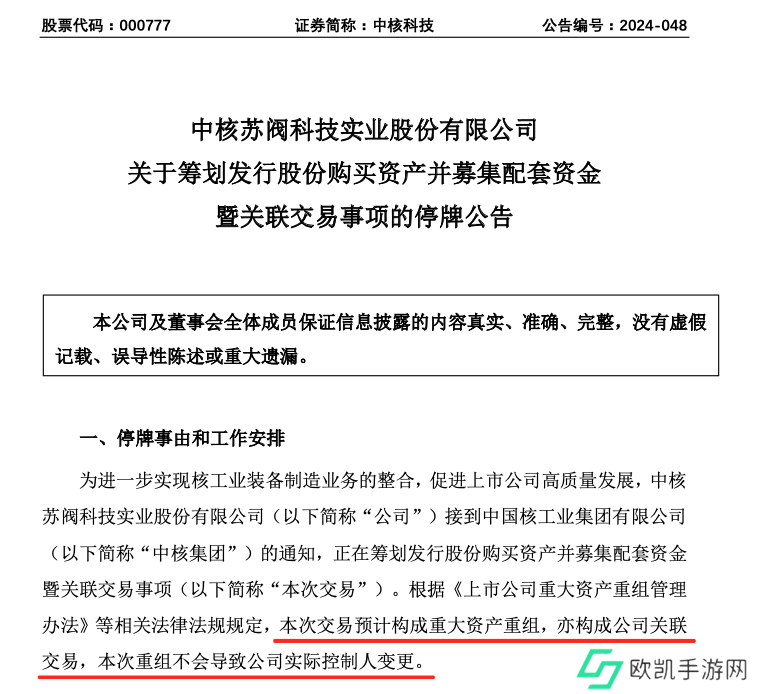 公告显示,为进一步实现核工业装备制造业务的整合,促进上市公司高质量发展,中核科技接到中国核工业集团有限公司(简称“中核集团”)的通知,正在筹划发行股份购买资产并募集配套资金暨关联交易事项,本次重组不会导致公司实际控制人变更。