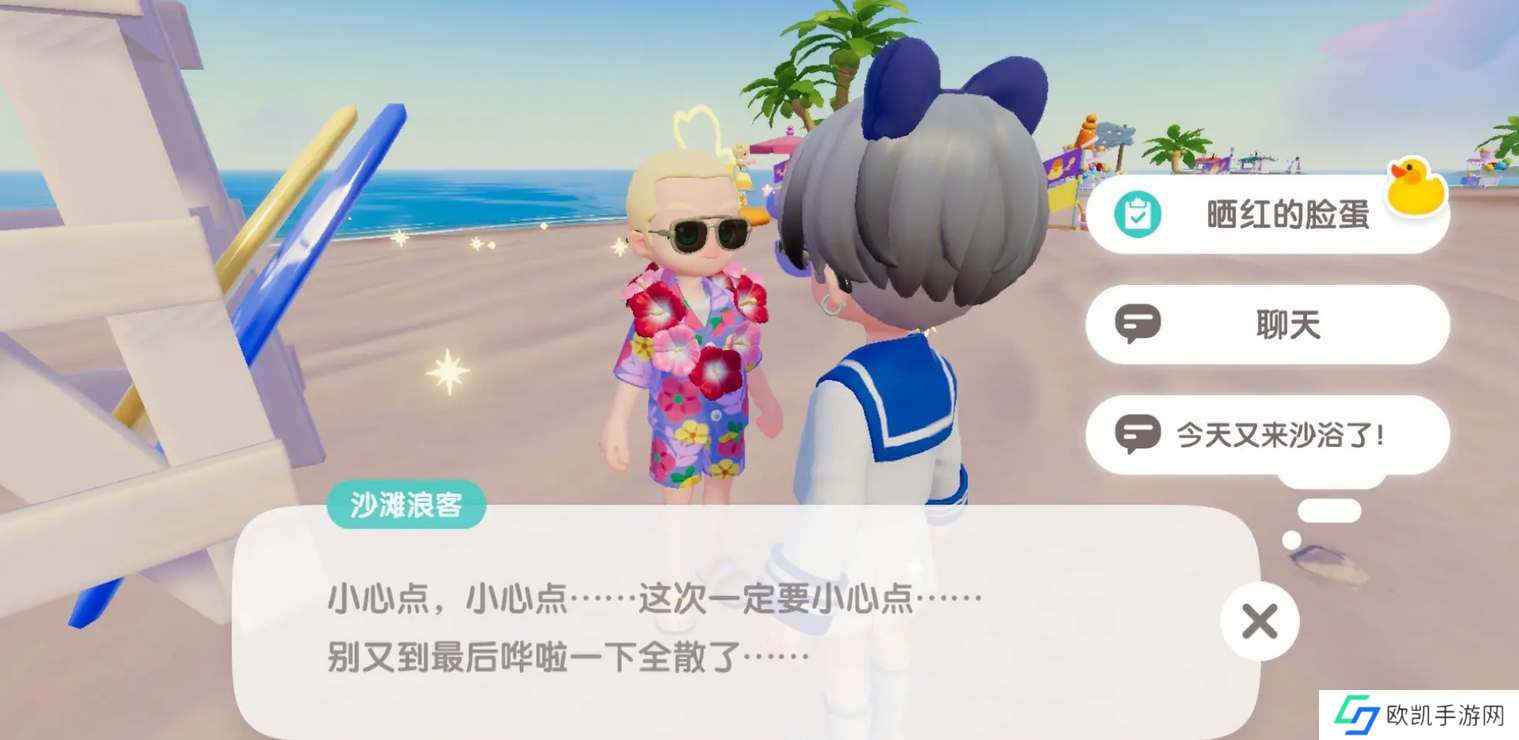 完成日常沙浴任务后获得腮红装扮,在小鬼店旁边的镜子前装备任务给的腮红,找沙滩浪客对话可触发隐藏任务。