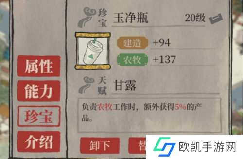 2、游戏中的人物装备玉净瓶,能够加成他们的建造、农牧属性。