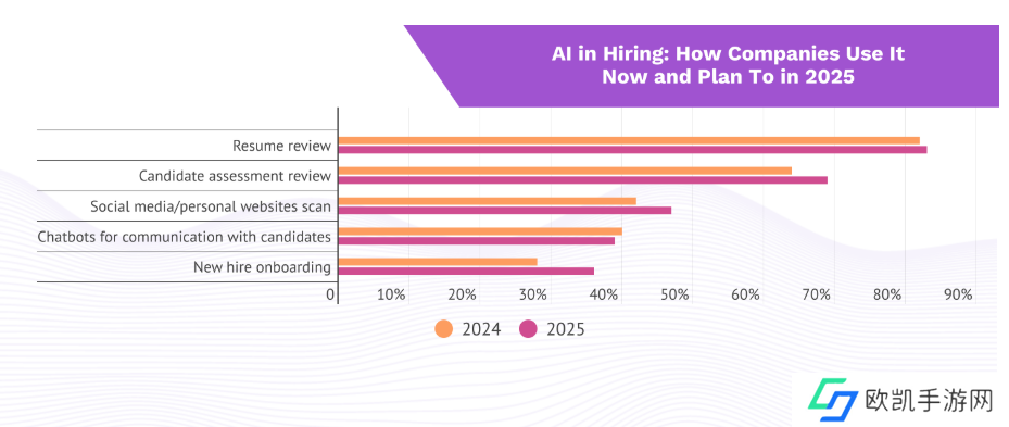 本站从市调机构 Resume Builder 最新报告获悉,目前,超过一半(本站注:51%)的公司正在其招聘流程中使用 AI 技术,而且这个数字还会上升。到 2025 年底,68% 的公司将使用 AI 来招聘新人才。