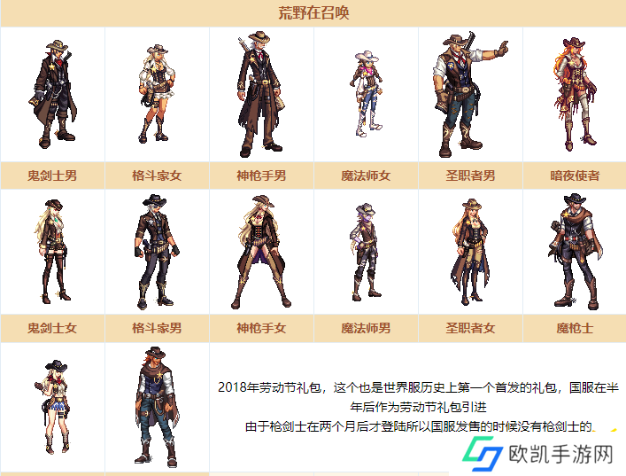 2018年劳动节礼包,这个也是世界服历史上第一个首发的礼包,国服在半年后作为劳动节礼包引进,由于枪剑士在两个月后才登陆所以国服发售的时候没有枪剑士的。
