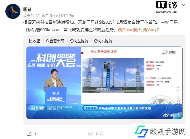 本站 12 月 13 日消息,根据博主 @囩昔 放出的 PPT,天兵科技在第四届科创大会演讲中透露,天龙三号计划于 2025 年 5 月开启首飞,首飞成功后将为其安排五次商业航天任务。