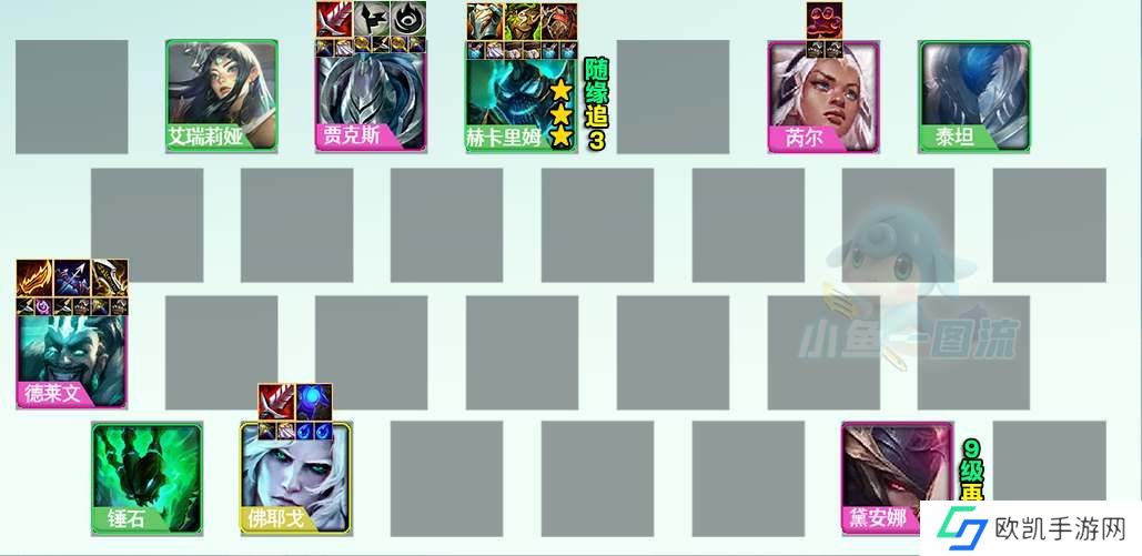 1、阵容构成:锤石+泰坦+刀妹+人马+德莱文+芮尔+武器+皎月+佛耶戈;