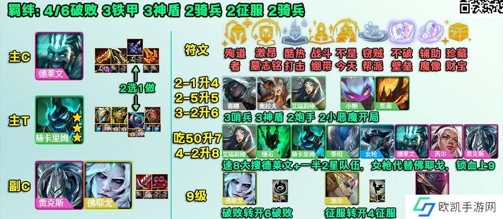 2、羁绊搭配:4/6破败3铁甲3神盾2骑兵2征服;