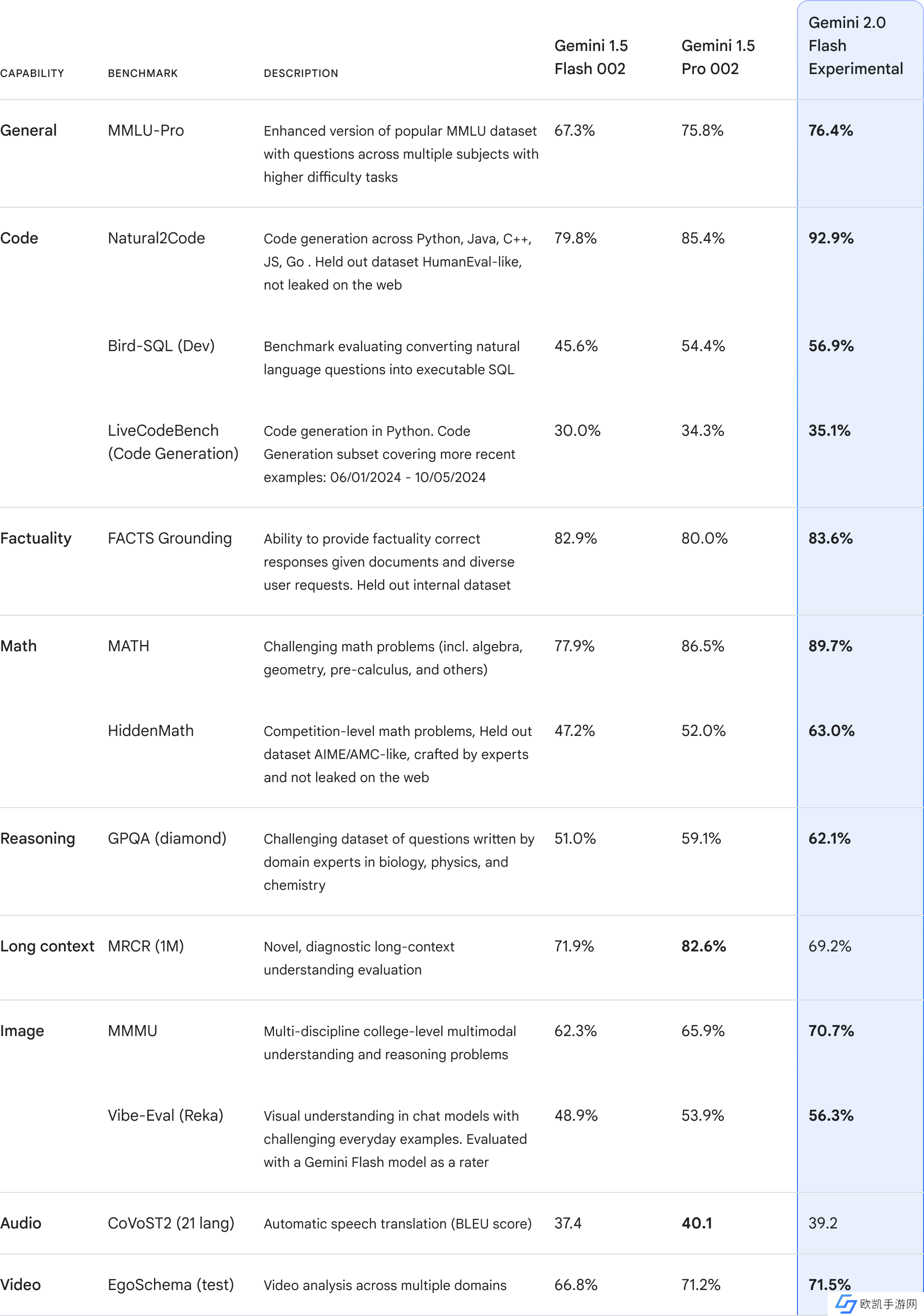如图所示,Gemini 2.0 在关键基准测试中相对于Gemini1.5 Pro 实现了大幅性能提升而且延迟更低,谷歌官方的表述是“关键基准测试中超越了 1.5 Pro,速度是其两倍”。