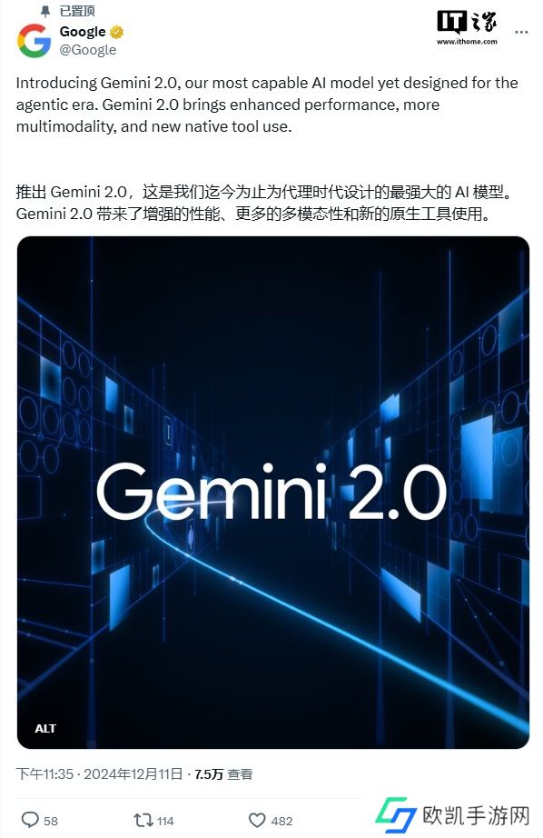 本站 12 月 11 日消息,谷歌正式发布 Gemini 2.0,号称是谷歌迄今为止功能最强的 AI 模型,带来了更强的性能、更多的多模态表现(如原生图像和音频输出)和新的原生工具应用。
