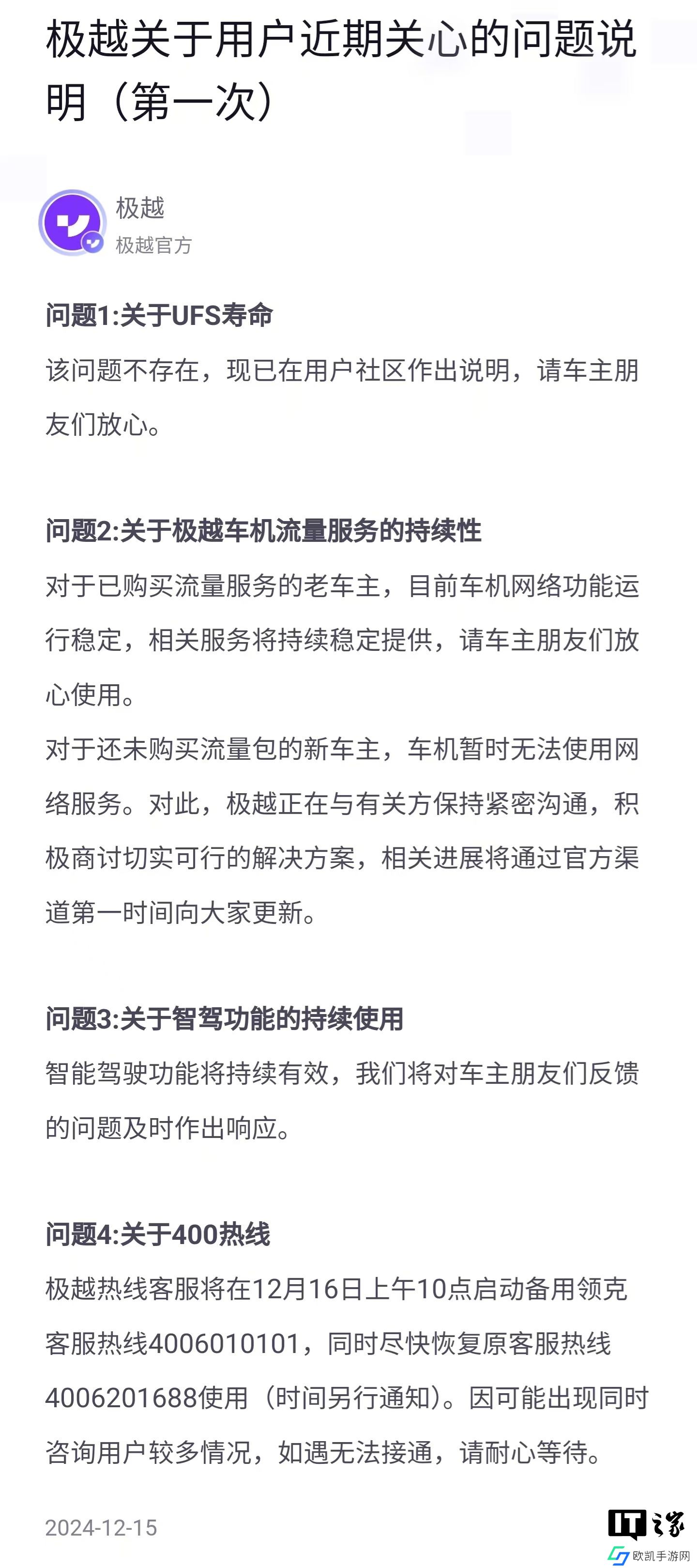 本站 12 月 15 日消息,极越今晚在官方 App 发布“极越关于用户近期关心的问题说明(第一次)”,回应了关注车机流量、智驾等方面问题。