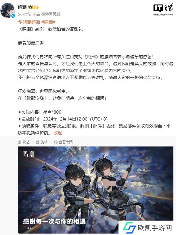 值得一提的是,《鸣潮》早在 11 月获得 TGA 2024 最佳移动游戏提名之时,已经向全服发放 1000 星声奖励。