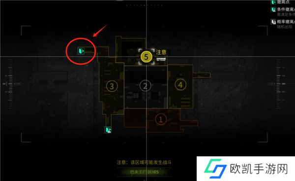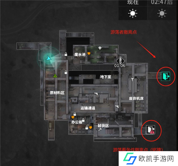 选择游荡者开局与一般对局不同,游荡者有专属的撤离点,同样也分为撤离点和条件撤离点,比如在巴夫工厂这张地图,萤火虫的撤离点在左侧,而游荡者的撤离点在地图的右侧,如果大家想玩游荡者的话,要注意这点(不同时段撤离点位置会有变化,本局游荡者撤离点如图示)。