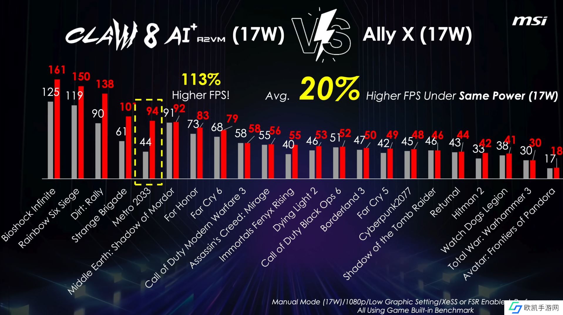 结果显示,在同时处于 17W 功耗模式下,其性能比华硕 ROG Ally X 高出了大约 20%(22 款游戏中的平均表现),在《地铁 2033》中最高可实现 113% 的性能优势。