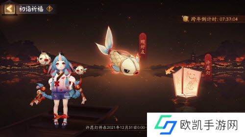 2、12月31日8:00-12月31日23:59期间,等级≥15级的大人们,点击庭院右侧小纸人进入活动页面,选择「福鲤灯」为好友送去祝福语,还可选择「心愿灯」写下自己的祈愿,放飞天灯即可领取神秘的符咒、体力等奖励;