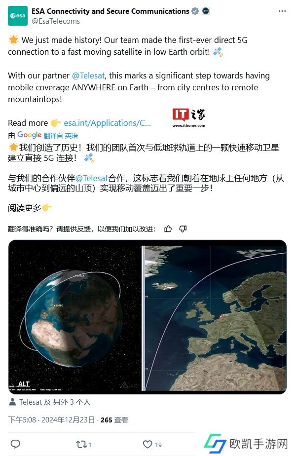 本站 12 月 25 日消息,欧空局(ESA)于 12 月 23 日发布博文,携手加拿大卫星通信公司 Telesat,成功实现全球首个基于低地球轨道(LEO)的 3GPP 非地面网络(NTN)连接,标志着卫星通信技术的重大突破。