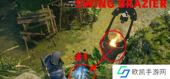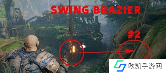 12、再让塔吊右转,拉着火盆往右边摆动点燃附近的第二个符文机关。