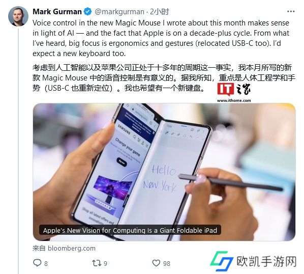 古尔曼在最新推文中认为,结合 AI 发展趋势,未来妙控鼠标加入语音控制功能,可谓是顺理成章。