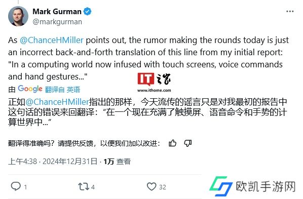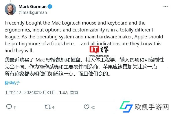 本站 12 月 31 日消息,彭博社记者马克・古尔曼(Mark Gurman)今天(12 月 31 日)在 X 平台发布推文,表示虽然目前没有听到相关的曝料线索,但认为苹果为妙控鼠标加入 AI 语音控制功能“合情合理”,引发了对苹果下一代鼠标的热议。
