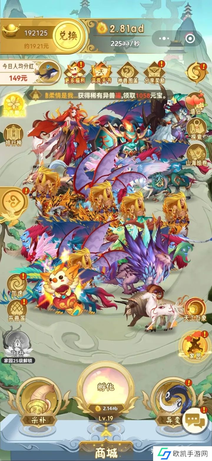 ①这个游戏刚开始点孵化买异兽,升到十二三级,后边使用异变(右上角获取幸运值,做到100幸运值以上)和家园拉蛋(升级家园上阵异兽更多,资源更高级)。