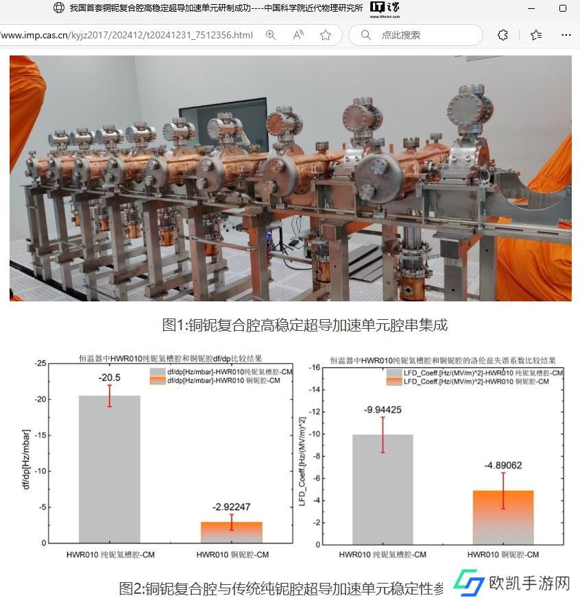 本站 1 月 1 日消息,据中国科学院近代物理研究所消息,由该所自主研制的我国首套铜铌复合腔高稳定超导加速单元成功通过各项测试研制成功,标志着我国面向高可靠应用的铜铌复合超导腔技术研究取得突破性进展。