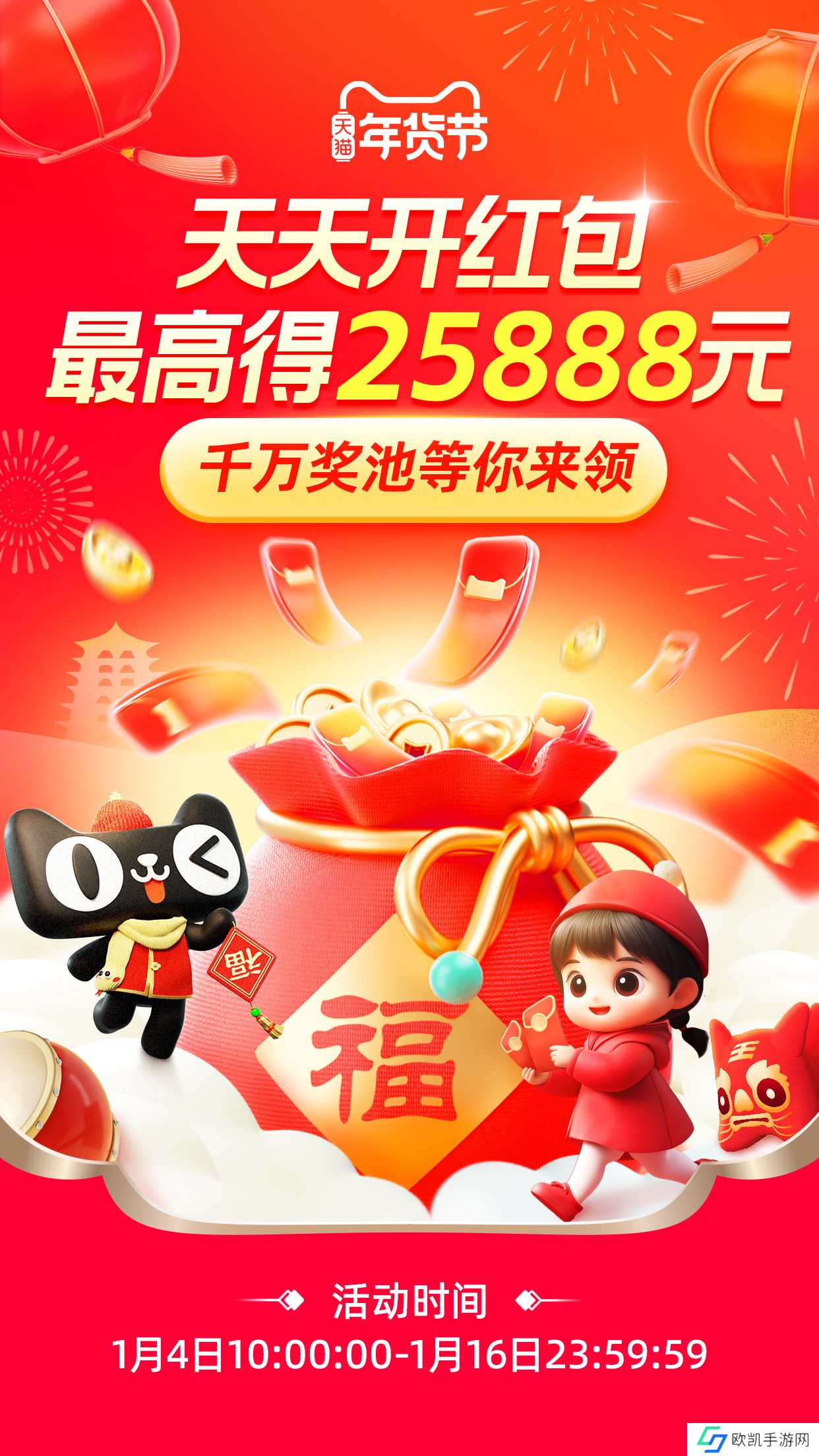 天猫 2025 年货节现金红包 1 月 4 日 10:00 正式开抢,面额至高 25888 元:点此抽红包。