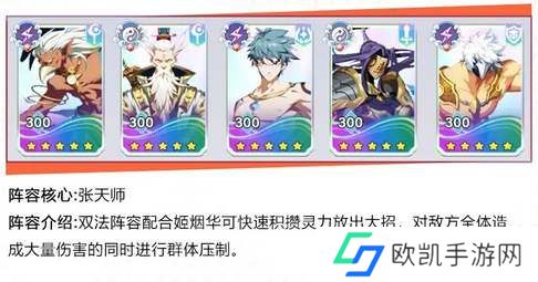 道法无穷流:双法阵容,配合姬烟华可快速积赞灵力放出大招,对敌方全体造成大伤害的同时进行群体压制。