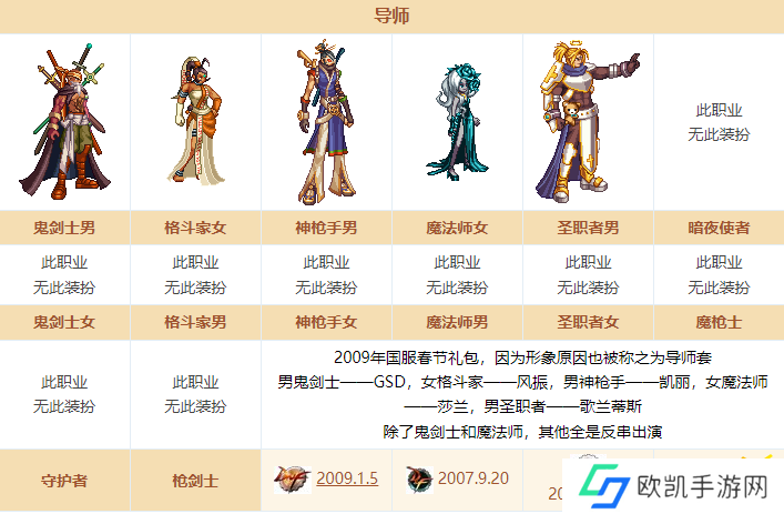 2009年国服春节礼包,因为形象原因也被称之为导师套,男鬼剑士——GSD,女格斗家——风振,男神枪手——凯丽,女魔法师——莎兰,男圣职者—歌兰蒂斯,除了鬼剑士和魔法师,其他全是反串出演。