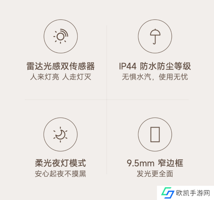 这款面板灯配备9.5mm边框,拥有IP44防水防尘,防蓝光危害等级RG0,拥有Ra90显色指数,配备夜灯模式,在毫米波雷达和光感传感器下可实现感知人体存在,同时在蓝牙Mesh加持下可联动各种设备创建智能场景。