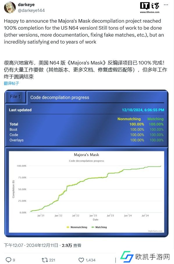 六个月来,该项目完成度一直徘徊在 90% 左右,但 ZeldaRET 成员 darkeye 本周三正式宣布完成度已达 100%。当然,他们仍有大量优化工作要做,例如删除错误的依赖项,并添加更多文档。通常,这需要涉及大量的反复试验、编写和编译代码,然后将结果与原始代码进行对比查证。