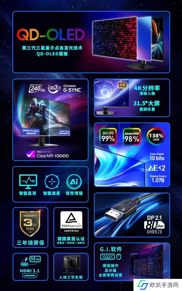 此外这款显示器支持3 年烧屏保,并采用了 OLED CARE 技术来防止烧屏现象。在护眼技术方面拥有莱茵认证的护眼技术,并可减少蓝光输出,以及画面不闪屏等技术。