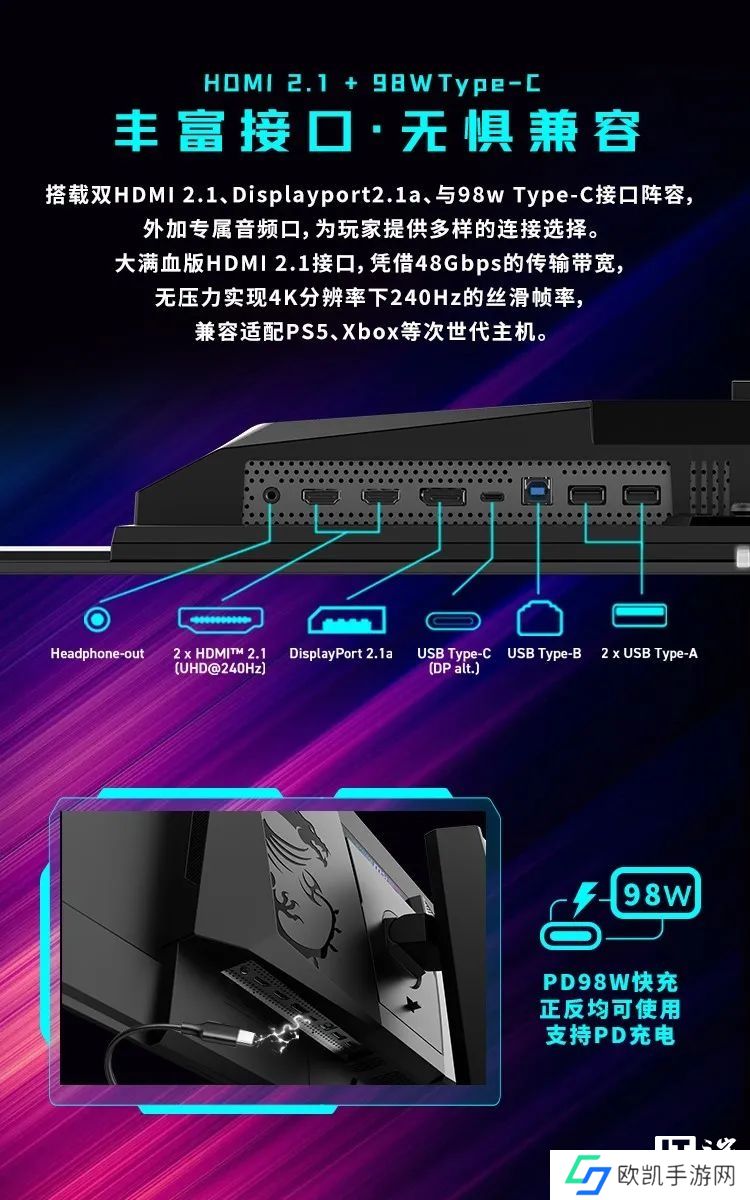 这款显示器配备了满血的 DP 2.1(UHBR20)接口,还有2 个 HDMI 2.1、1 个多功能 Type-C(支持 4K 240Hz 视频传输与 98W PD 供电)、2 个 USB-A、1 个 USB-B 接口以及音频输出插孔。