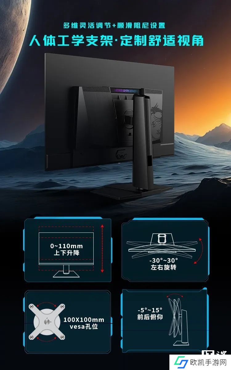 在支架上支持上下升降、左右旋转以及俯仰调节,由于采用的是标准 VESA 孔距,所以也能安装显示器支臂用。