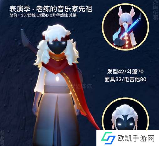 3、兑换物品有动作、面具、发型、斗篷和乐器电吉他,兑换所有的物品需要237蜡烛,13爱心和2升华蜡烛。玩家们也可以选择自己喜欢的部件兑换。