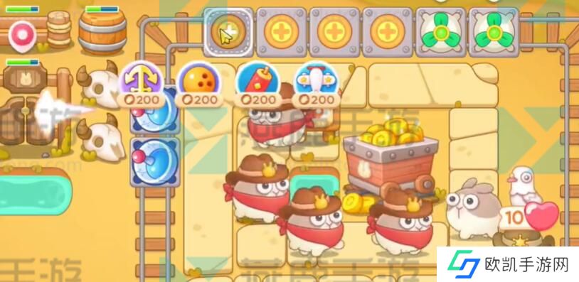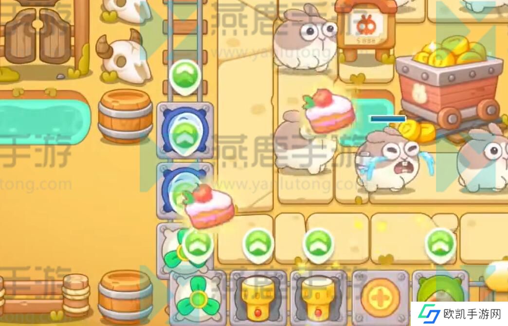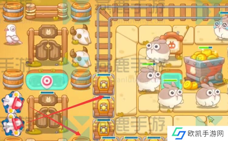 6、兔子的行动轨迹是在轨道里面的,在轨道外多放几个保龄球就能够全方位的攻击了。