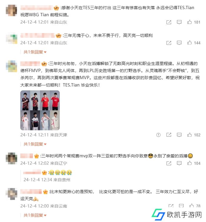TES粉丝在这条离队微博下对Tian的离队送出祝福