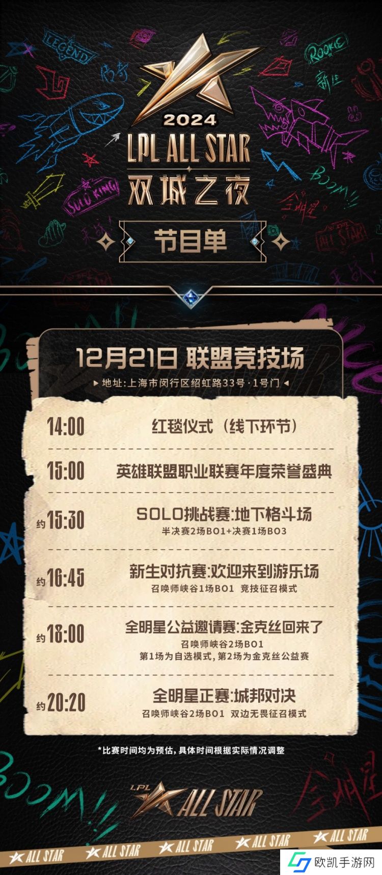 直播吧12月11日讯 2024英雄联盟职业联赛全明星-双城之夜将于12月21日举行。全明星-双城之夜日程安排以及节目单如下: