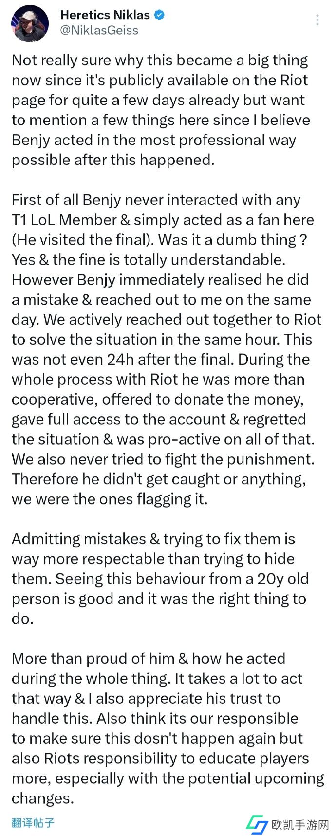 首先,Benjy从未与任何T1 LoL成员有互动,他只是以粉丝的身份参与(他观看了决赛)。**这件事本身是否有点愚蠢?是的,罚款完全可以理解。然而,Benjy在意识到自己的错误后,立刻于当天主动联系了我。我们在第一时间共同联系了Riot来解决这个问题,这一切发生在决赛结束后不到24小时内。在与Riot的整个沟通过程中,他表现得非常配合,主动提出捐款,完全开放了账号权限,并对事情的发生深感后悔,表现得非常积极主动。而且,我们从未试图抗辩这次处罚。换句话说,他并不是被抓到的,而是我们主动汇报的。