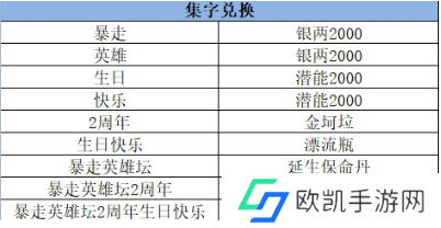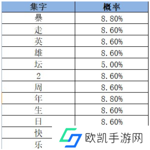 通过打开“周年庆集字福袋”随机获得:暴、走、英、雄、坛、2、周、年、生、日、快、乐。12个字其中之一;
