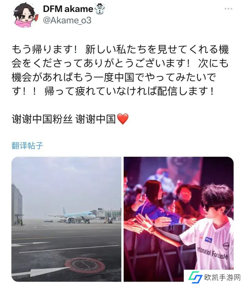 在无畏契约源能亚洲邀请赛决赛中,DFM以1-3的比分不敌PRX。DFM战队于今日回国,Akame选手发文: