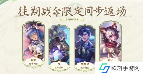 嫦娥-暖冬兔眠、暃-星界游侠、高渐离-燃音魔法和妲己-灵卜魔法,加入战令兑换商店、通过战令币购买礼包获取。