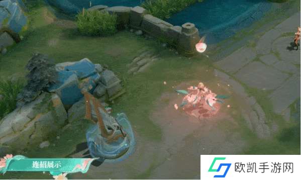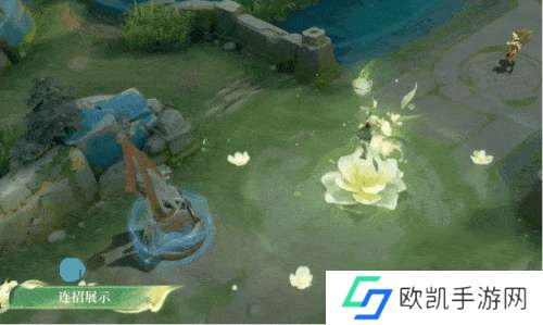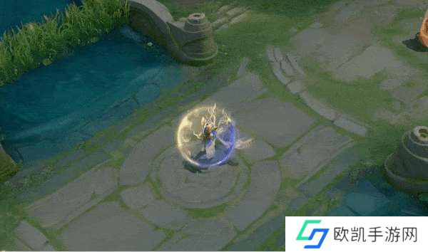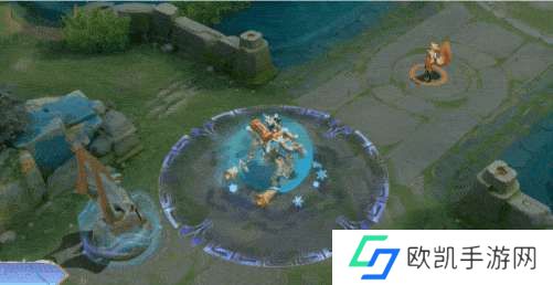 技能特效以青黄色为主,标枪在地面生成茶叶的图案,由于是勇者皮肤因此特效比较简单,不过打击感还是蛮利落的。