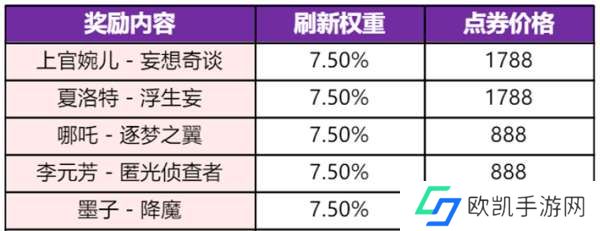 此次加入了五款限定皮肤:上官婉儿-妄想奇谈、夏洛特-浮生妄、哪吒-逐梦之翼、李元芳-匿光侦查者和墨子-降魔。