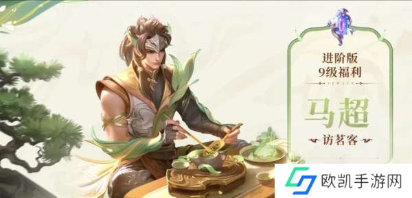 马超-访茗客、品质勇者限定,进阶版战令9级获取,造型设计上马超身穿褐黄色长袍,护手和肩甲做成了绿草的样式。