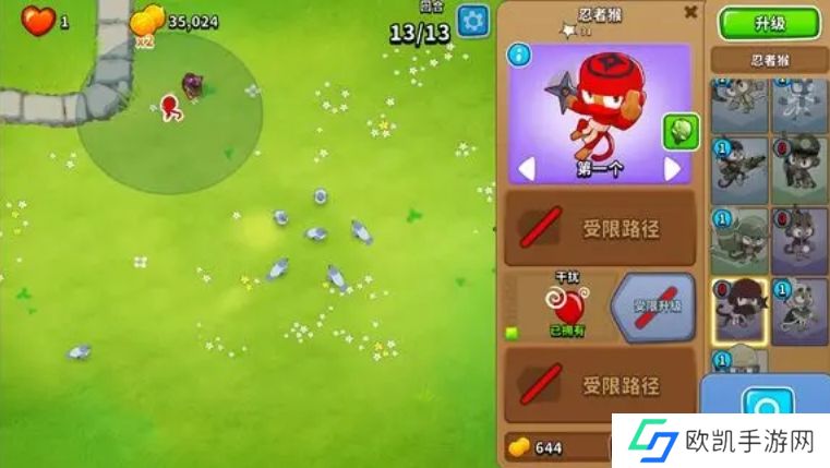 2、思路到这里,剩下是摆位子,不能贴着路径放忍者和法师,因为中间会有一个绿气球狙击攻速跟不上,忍者法师会去打,后果就是节奏乱了。