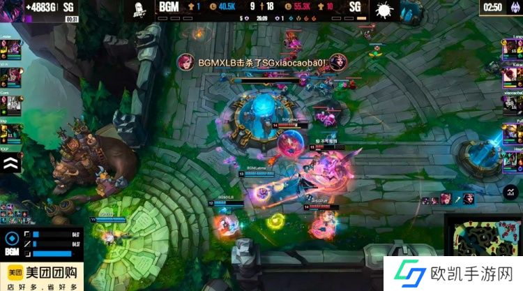 【19:03】上路团战,xiaocaobao乐芙兰魔影迷踪一秀四,SG抱团追击先击杀xxp牛头,还想越塔强杀!尽管上路丝血的一塔给足了伤害,但是这波还是SG最终打出了2换3!