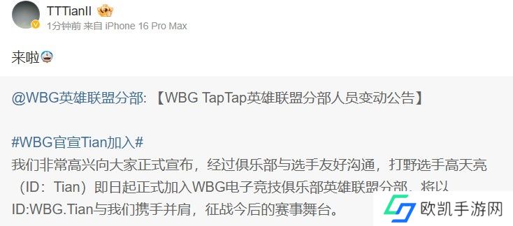 直播吧12月4日讯 WBG官宣了打野选手Tian的加盟,Tian选手转发官宣微博,并配文:来啦~