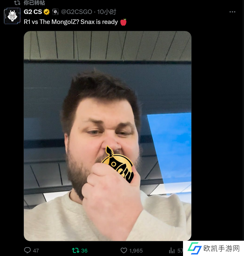 The MongolZ。而对于这样的对手,G2官方账号也开启了整活模式,队内指挥Snax手持贴有The MongolZ标识的苹果狠狠咬下,寓意不言而明。