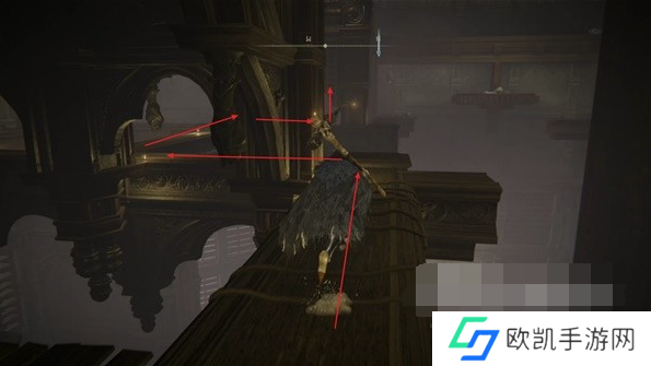 9、乘坐这个赐福旁边的升降梯上去,升降梯停下后走到前方木横梁的位置往左走,沿着下图路线爬第一个楼梯。
