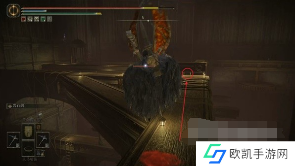 7、然后爬左边的梯子往上走,上面楼梯口前方有一个火焰骑士需要注意,然后沿着右侧的楼梯继续往上爬。